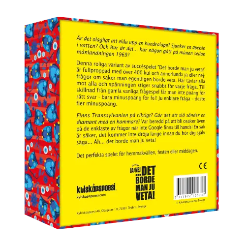 Denna roliga variant av succéspelet ”Det borde man ju veta!” är fullproppad med över 400 kul och annorlunda ja eller nej frågor om saker man egentligen borde veta. Här tävlar alla mot alla och spänningen stiger snabbt för varje fråga. Till skillnad från traditionella frågespel får man inte poäng för rätt svar - bara minuspoäng för fel! Ju enklare fråga - desto fler minuspoäng.